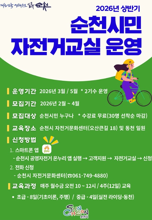 신청은 자전거 교실 운영 전 ‘순천시 공영자전거 온누리 앱’을 통해 가능하고, 자전거문화센터 방문 및 전화 접수도 병행한다.