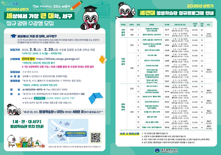 박현숙 행복교육과장은 “서구민 모두가 언제 어디서나 배우는 기쁨을 누릴 수 있도록 내 곁에 평생학습을 실현하고자 다양한 강좌를 준비했다”며 “세큰대 정규강좌를 통해 주민들이 배움을 통해 삶의 만족과 행복을 높이는 계기가 되길 바란다”고 말했다.