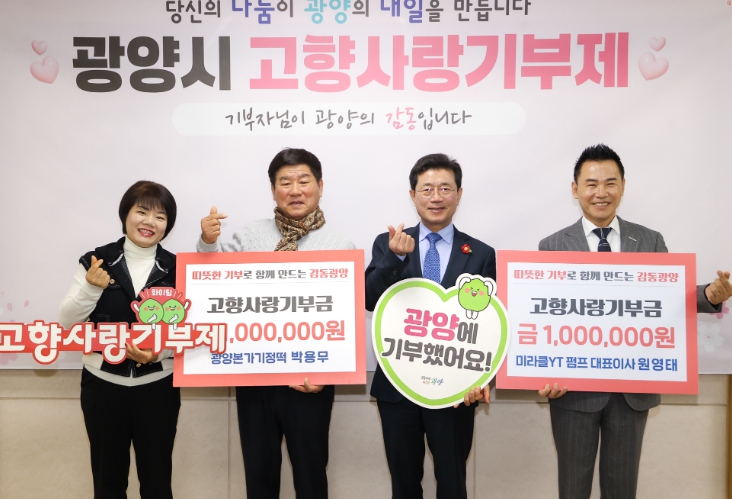 광양시 관계자는 “광양 발전을 위해 늘 아낌없는 응원과 지지를 보내주시는 향우 여러분께 깊이 감사드린다”며 “기탁해 주신 기부금은 시민이 체감할 수 있는 살기 좋은 광양을 만드는 데 소중히 활용하겠다”고 말했다.
