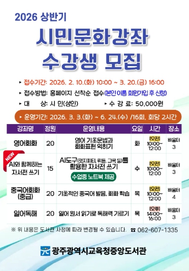강좌 참여 신청은 시민 누구나 가능하며, 도서관 누리집을 통해 선착순으로 접수하면 된다. 광주중앙도서관 본관은 10일부터, 분관 최상준도서관은 11일부터 신청할 수 있다.