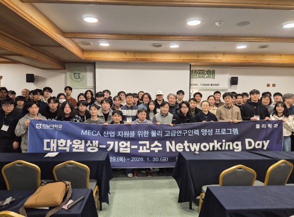 12일 전남대에 따르면, 전남대학교 물리학과는 ‘RISE사업’의 일환으로 지난 1월 29일부터 30일까지 1박 2일간 무주 덕유산리조트에서 MECA 산업 지원을 위한 물리 고급연구인력 양성을 목적으로 ‘대학원생(신진연구인력 포함)–기업 재직자(임·직원)–교수진 정기 Networking Day’를 성황리에 개최했다.