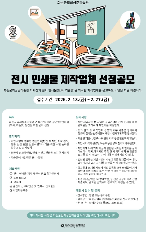 화순군은 이번 공모를 통해 전시 내용을 체계적으로 기록하고, 공공 미술관 전시 출판의 완성도를 한층 높일 계획이다.
