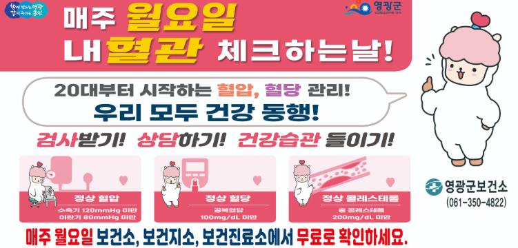 한편, '내 혈관 건강살피기'는 연중 상시 운영되며, 자세한 사항은 영광군보건소 방문보건팀으로 문의하면 안내받을 수 있다.