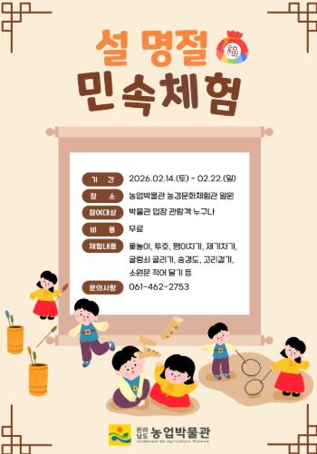 김옥경 전남도농업박물관장은 “설 민속 체험행사는 세대가 함께 참여해 전통문화를 몸으로 익히고 즐기도록 구성했다”며 “농업박물관을 찾아 가족과 함께 따뜻한 명절의 정을 느끼고, 전통의 가치를 되새기는 시간이 되길 바란다”고 말했다.