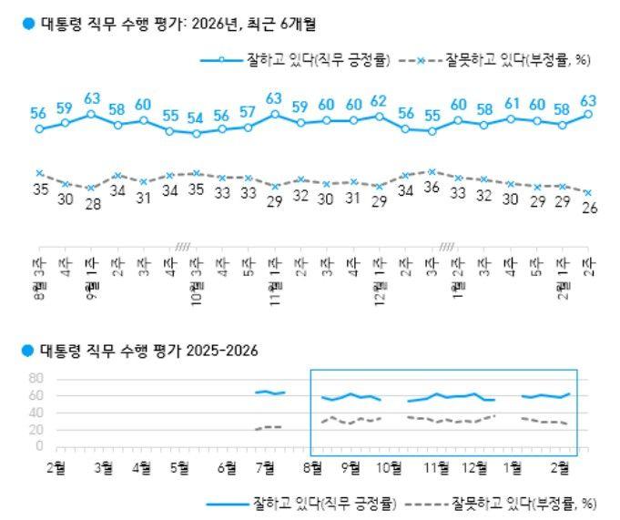 직전 조사(2월1주차) 대비 긍정 평가는 5%포인트(p) 올랐고, 부정평가는 3%p 내린 것으로 나타났다.