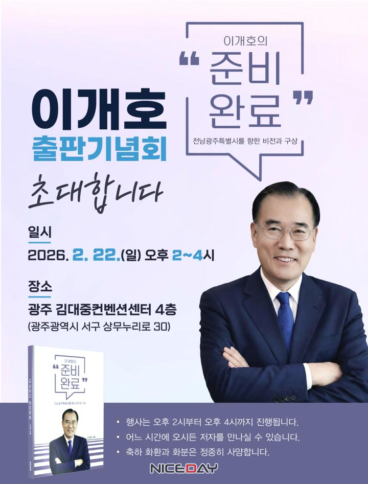 이개호 의원은 오는 22일(일) 광주 김대중컨벤션센터에서 정책 비전서 ‘이개호의 준비완료 - 전남광주특별시를 향한 비전과 구상’ 출판기념회를 개최한다.