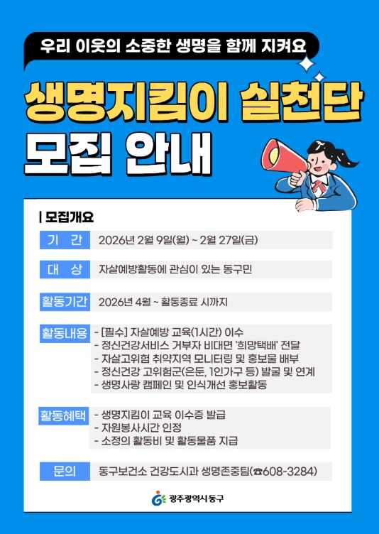 동구 관계자는 “생명지킴이 실천단은 위기에 놓인 이웃을 가장 가까이에서 살피는 중요한 역할을 하고 있다”며 “많은 주민들이 봉사하는 마음으로 자살예방 활동에 동참해 생명존중 문화가 지역사회 전반으로 더욱 확산되기를 바란다”고 말했다.