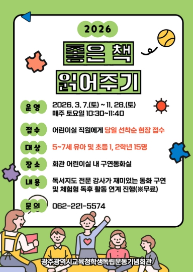 프로그램은 매주 토요일 오전 10시30분부터 11시40분까지 회관 내 구연동화실에서 진행되며, 전문강사가 아동 수준에 적합한 도서를 선정해 동화구연, 독후활동 등을 실시한다.