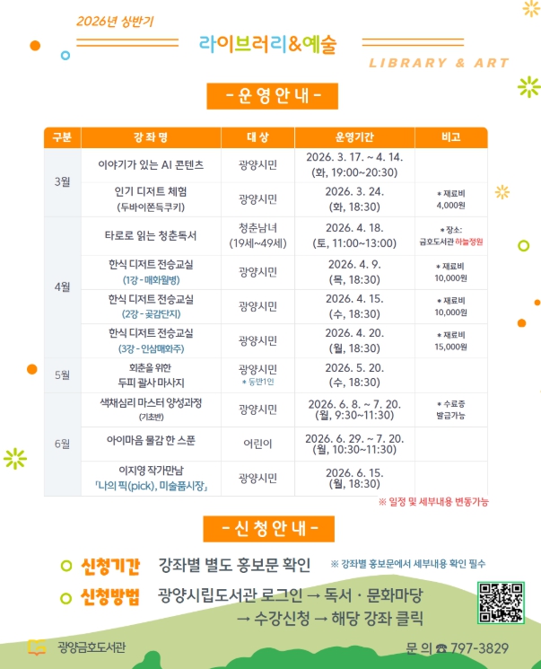 프로그램 신청은 강좌별 모집 일정에 따라 2월 23일 오전 10시부터 선착순으로 진행되며, 자세한 사항은 광양시립도서관 누리집에서 확인하거나 금호도서관으로 문의하면 안내받을 수 있다.