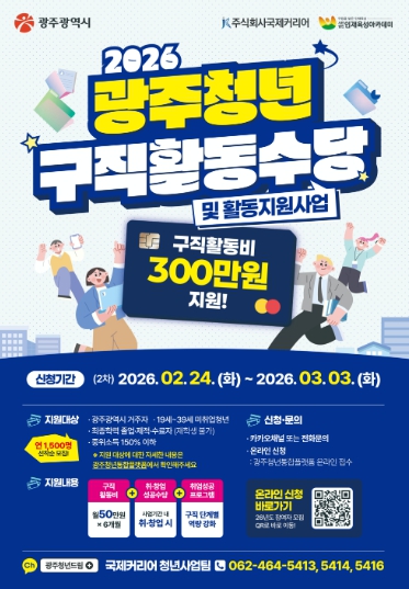 최종 선정자는 3월 중 광주청년통합플랫폼 마이페이지 또는 개별 문자메시지를 통해 발표하며, 4월부터 구직활동수당을 지급한다. 선정자는 온라인 예비교육 이수와 청년 구직활동수당 지급을 위한 클린카드 발급 절차 등을 거쳐야 한다.
