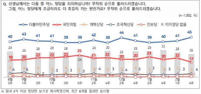 엠브레인퍼블릭·케이스탯리서치·코리아리서치·한국리서치가 지난 23~25일 만 18세 이상 남녀 1002명을 대상으로 진행한 NBS(전국지표조사)에서 정당 지지도는 민주당 45%, 국민의힘 17%로 집계됐다.