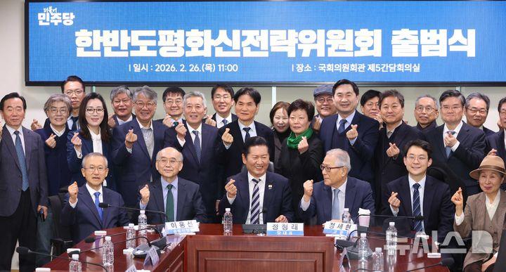 정 대표는 "평화가 주식이고 평화가 주가지수라고 말해도 과언이 아니지 않나"라며 "당에서 이재명 정부의 성공적인 외교 활동을 위해서 뒷받침하고자 한다. 그것이 오늘 출범하는 한반도평화위의 역할"이라고 덧붙였다.