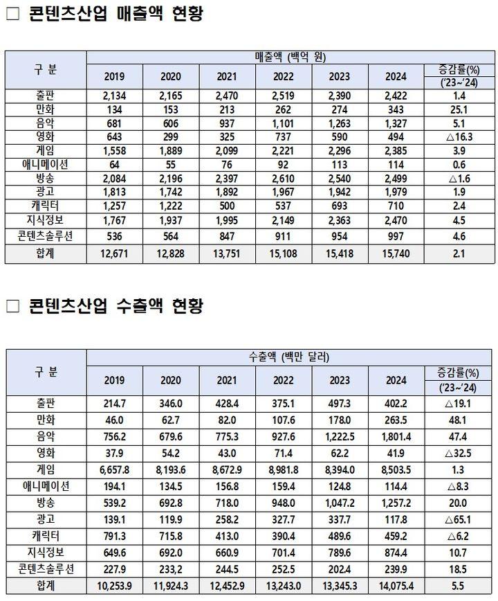 조사 결과에 따르면 2024년 국내 콘텐츠산업의 전체 매출액은 157조4021억원으로, 전년도 154조1785억원 대비 2.1% 증가했다.