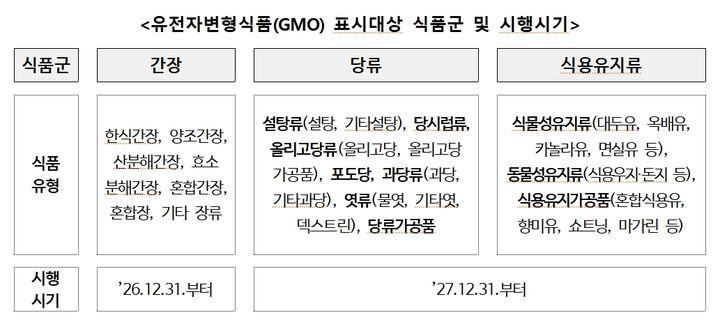 개정안에 따르면 식품용으로 승인된 유전자변형농축수산물을 원재료로 사용해 제조·가공한 간장, 당류 및 식용유지류는 제조·가공 후 최종제품에 유전자변형 DNA 또는 단백질이 남아 있지 않더라도 유전자변형식품(GMO)으로 표시해야 한다. 예를 들어 ▲유전자변형식품 ▲유전자변형 ○○ 포함 ▲유전자변형 ○○ 포함가능성 있음 등으로 표시한다.