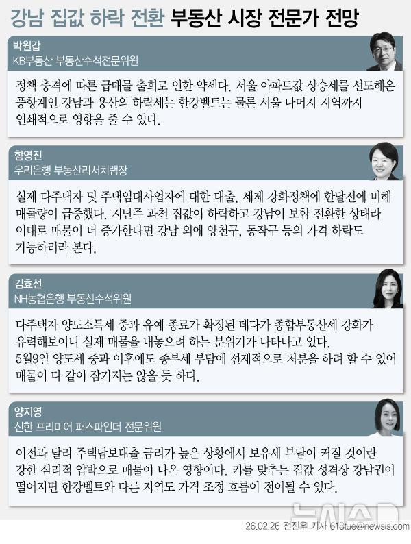 전문가들은 강남3구와 용산구에서 시작된 집값 약세가 한강벨트 등 주변 지역으로 전이되며 순차적으로 조정이 나타날 수 있다고 보고 있다.