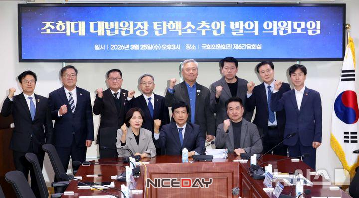 국회 '조희대 대법원장 탄핵 소추안 발의 의원 모임'은 이날 오후 국회 의원회관에서 간담회를 열고 이같은 내용의 탄핵소추안 발의 계획 등을 공유했다.