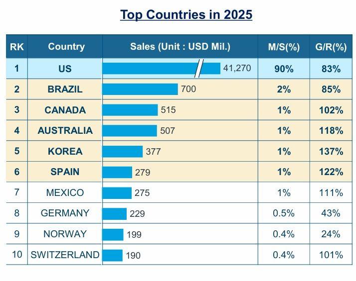 한국은 지난해 미국, 브라질, 캐나다, 호주에 이은 5위 시장을 기록했다. 3억7700만 달러(5786억원)로 상위 5개국 중 가장 성장률이 높았다. 전년보다 137% 증가했다.