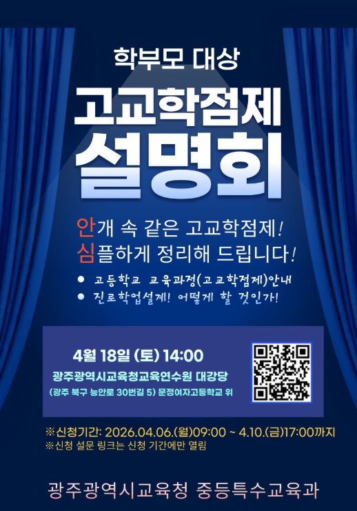 설명회에서는 광주고등학교 김정태 교사가 진로·학업 설계 및 고등학교 생활을 사례 중심으로 설명해 학부모들이 자녀의 고등학교 생활을 구체적으로 이해하고 진로·학업 설계 방향을 설정할 수 있도록 지원한다.