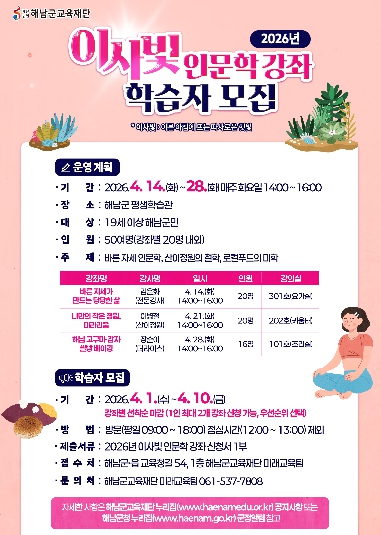 학습자 모집은 4월 1일부터 10일까지 교육재단 방문 접수를 통해 진행되며 1인 최대 2개 강좌까지 무료로 신청 가능하다. 모집 인원은 강좌별 20명 내외이며 모든 강좌는 매주 화요일 오후 2시부터 4시까지 해남군 평생학습관에서 진행된다.