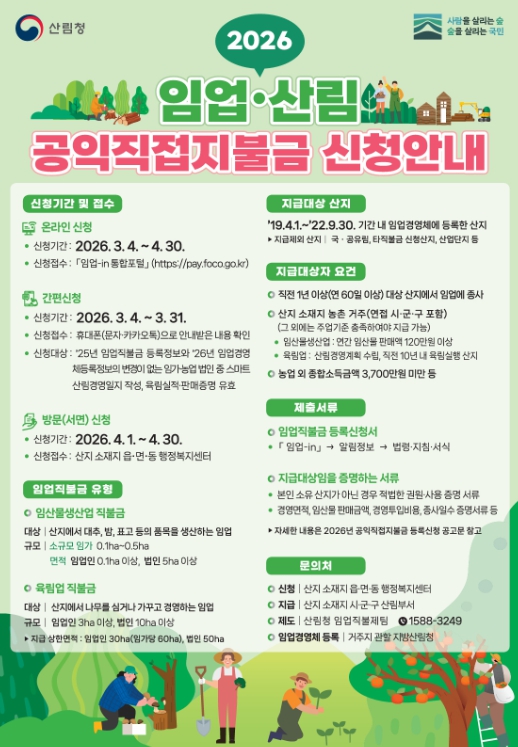 임업직불금은 임업인이 산림의 공익적 기능을 유지·증진하도록 지원하는 제도로, 임산물 생산업과 육림업에 종사하는 임업인과 농업법인을 대상으로 지급된다.