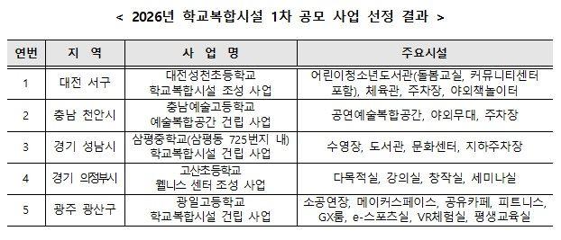 교육부는 14일 올해 학교복합시설 1차 공모 사업 선정 결과를 발표했다.