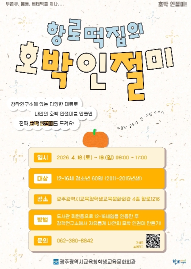 이번 프로그램은 전국적으로 뜨고 있는 광주 대표 먹거리 중 하나인 ‘호박 인절미’를 활용해 청소년들이 창작활동을 할 수 있도록 지원하기 위해 마련됐다.