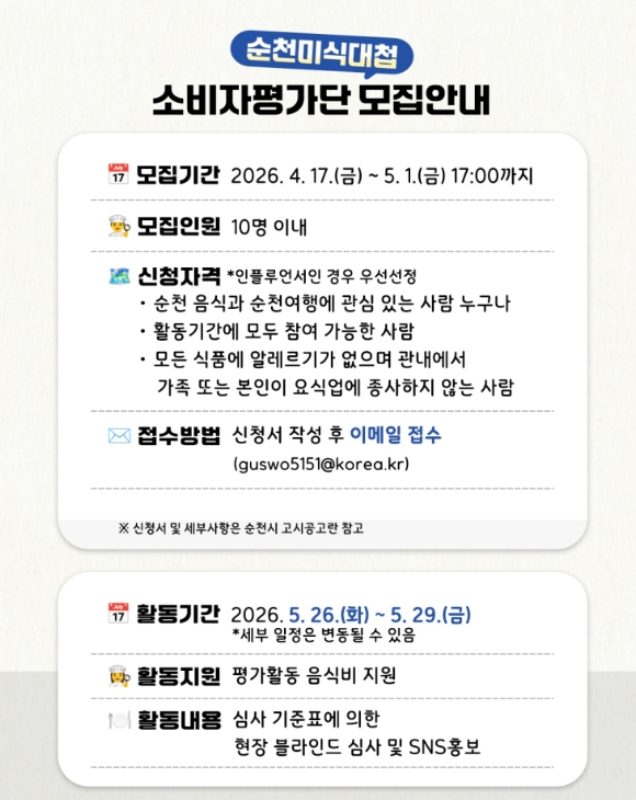 소비자 평가단은 총 10명 이내로 선발되며, 순천 음식과 여행에 관심 있는 사람이라면 누구나 지원할 수 있다.