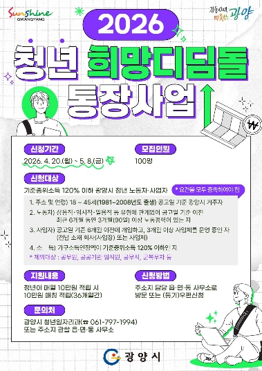 광양시 관계자는 “청년 희망디딤돌 통장사업이 청년들에게 필요한 자금 마련에 도움이 되길 바란다”며 “청년이 지역에 안정적으로 정착하고 미래를 준비할 수 있도록 지원하겠다”고 말했다.