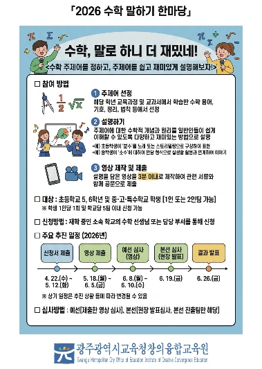 광주창의융합교육원 진영 원장은 “수학 말하기 한마당은 학생들이 수학 원리를 스스로 설명하며 즐기는 축제의 장이다”며 “학생들이 수학적 표현력을 발휘해 창의융합형 인재로 성장할 수 있도록 운영하겠다”고 말했다.