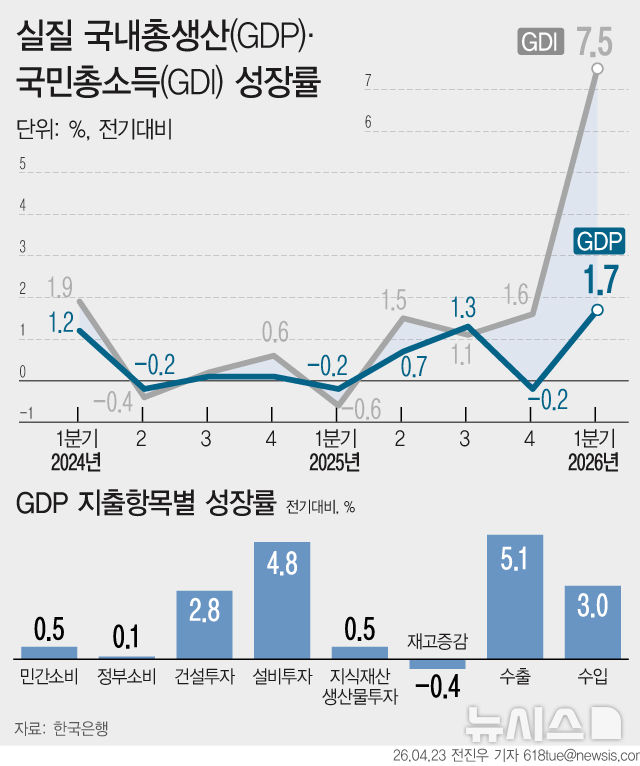 24일 한은이 전날 발표한 '2026년 1분기 실질 국내총생산(GDP)' 속보치에 따르면 1분기 GDP 성장률은 전기 대비 1.7%를 기록했다. 이는 2020년 3분기(2.2%) 이후 가장 높은 수준이다.