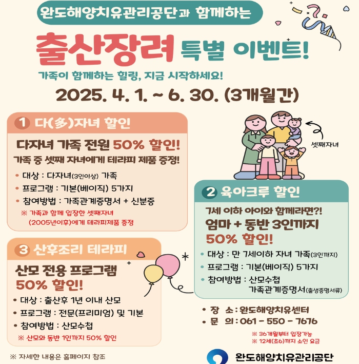 저출산을 극복하자는 의미에서 추진하는 다자녀·육아 가족 대상 이벤트는 3명 이상의 자녀를 둔 가정을 대상으로 6월 30일까지 50%를 할인하며, 셋째 자녀에게는 테라피 제품도 증정한다.