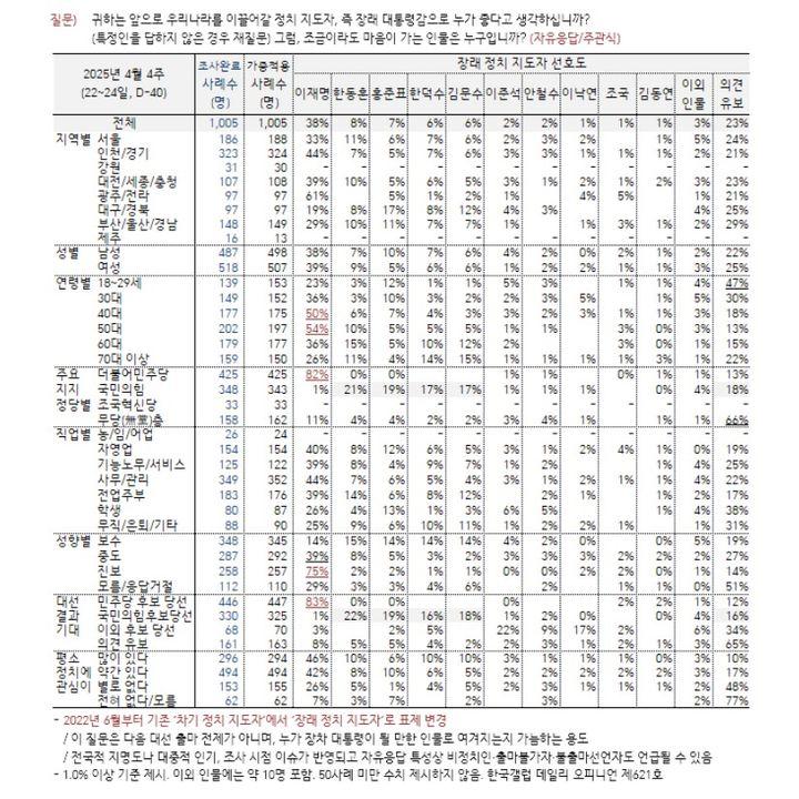 민주당 지지층(425명)에서는 이 전 대표가 82% 압도적 지지를 받았다. 국민의힘 지지층(348명)에서는 한 전 대표 21%, 홍 전 시장 19%, 한 대행·김 전 장관 17%, 이 후보·안 의원 1%로 나타났다.