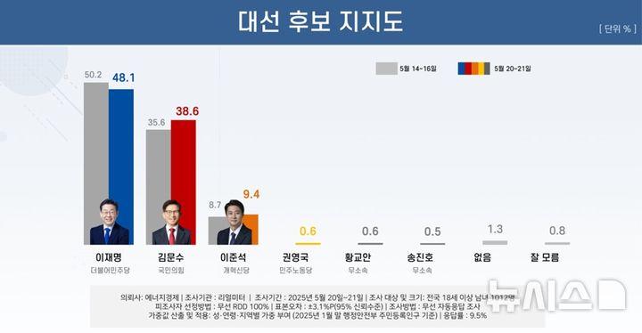 리얼미터가 에너지경제신문 의뢰로 지난 20~21일 전국 만 18세 이상 유권자 1012명을 대상으로 조사한 결과 이재명 후보 48.1%, 김 후보 38.6%로 나타났다.