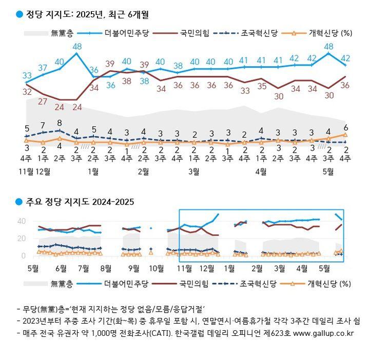 직전 조사(5월 3주차) 대비 민주당의 정당 지지도는 6%포인트(p) 하락했고, 국민의힘은 6%p 상승했다. 양당의 지지도 격차는 지난 조사(18%p) 대비 12%p 줄어 오차범위 내인 6%p로 좁혀졌다. 개혁신당의 지지도는 창당 후 최고치를 기록했다.