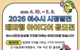 광주 이자형 기자2026. 04.09[나이스데이]여수시는 시민들의 참신하고 창의적인 의견을 정책에 반영해 ‘시민이 참여하는 시정’을 실현하고자 오는 4월 10일부터 5월 8일까지 ‘2026년 여수시 시정발전 테마형 아이디어 공모전’을 실시한다고 밝혔다. 이번 공모전은 ‘일상에 가치를 더하는 7가지 아이디어’라는 주제로, 시민 생활과 밀접한 현안들에 대한 해결 방안을 발굴하기 위해 마련됐다. 공모 분야는 시민 삶의 질을 높일 수 있는 7개 분야로 ▲나눔문화(자원봉사, 기부 등) 활성화 ▲1회용품 사용감량 ▲불법 옥외광고물 정비 및 활용 ▲자전거 이용 활성화 ▲지역사…