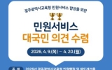 [나이스데이]광주시교육청은 민원서비스 품질 향상을 위해 오는 9~20일 국민권익위원회 온라인 정책참여 플랫폼 ‘국민생각함’과 ‘시교육청 누리집’을 통해 대국민 의견을 수렴한다. 이번 의견 수렴은 국민의 다양한 목소리를 민원행정과 제도개선에 반영해 광주교육 민원서비스 만족도를 높이기 위해 추진됐다. 의견 수렴 내용은 ▲민원서비스 향상을 위한 제도 개선 ▲민원실 편의시설 및 환경 개선 ▲기타 민원서비스 이용 시 불편사항 및 개선 아이디어 등이다. 지난해 실시한 ‘2025년 민원서비스 개선 대국민 의견수렴’에는 595명의 국민이 …