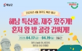 해남 박남도 기자2026. 04.17[나이스데이]해남군은 바다 건너 제주 소비자를 찾아 오는 17일부터 19일, 3일간 제주시농협 하나로마트 제주점 야외특설매장에서 농수특산물 직거래장터를 운영한다. 이번 행사에서는 해남고구마를 비롯해 잡곡류, 차류, 가공식품 등 100여종의 다양한 농수특산물을 합리적인 가격으로 선보일 예정이다. 특히 이번 행사에서는 소비자 참여를 높이기 위한 다양한 이벤트도 함께 마련됐다. 행사 기간 동안 5만원 이상 구매 고객에게는 해남 특산물을 증정하며, 10만원 이상 구매 고객에게는 1+1 해남 특산물 추가 증정 혜택을 제공한다. 또한 해남군…