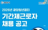 광양 손태성 기자2025. 12.01[나이스데이]광양시는 2026년 한 해 동안 광양청년꿈터 운영을 함께할 기간제근로자 4명을 모집한다고 1일 밝혔다. 채용인원은 ▲센터장 1명 ▲매니저 3명 등 총 4명이다. 센터장은 운영 총괄과 사업계획 수립, 프로그램 기획 등을 담당하며, 매니저는 시설 관리, 데이터·통계 업무, 온라인 채널 운영, 청년정책 및 청년꿈터 홍보 등 실무 전반을 맡는다. 응시를 위한 공통 요건은 △공고일 기준 18세 이상(단, 남성은 계약기간 중 군 복무 예정이 없는 자) △공고일 이전부터 광양시에 주민등록을 두고 관내에 거주하고 있는 자다. 센…