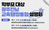 교육 이자형 기자2026. 03.11[나이스데이]광주시교육청이 학부모의 교육행정통합 궁금증을 해소하기 위해 두 차례에 걸쳐 ‘광주·전남 교육행정통합 설명회’를 개최한다. 첫 번째 설명회는 17일 오후 1시30분 광주시민협치진흥원에서 열리며, 이어 24일 오전 9시30분 AI교육원에서도 진행된다. 설명회는 ▲교육행정통합 추진 배경 및 경과 안내 ▲통합 이후 교육정책 변화와 전망 설명 ▲학부모 질의에 대한 답변 등 순으로 운영된다. 특히 이정선 교육감이 교육행정통합 추진 경과, 전망 등을 설명하고 학부모들의 질의에 응답하며 궁금증을 해소할 예정이다. 참여를 희망하…