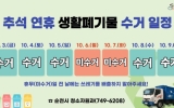 순천 손태성 기자2025. 09.29[나이스데이]순천시는 추석 연휴 기간 생활폐기물로 인한 시민 불편을 최소화하고, 쾌적한 도시 환경을 조성하기 위해 ‘추석 연휴 생활폐기물 수집․운반’을 안정적으로 추진한다. 추석 연휴 기간 동안 종량제 및 재활용, 음식물쓰레기 등 생활폐기물 수거는 10월 3일 금요일부터 10월 5일 일요일까지 정상적으로 이뤄지며, 추석 당일인 10월 6일 월요일과 10월 7일 화요일까지 이틀간은 수거하지 않는다. 10월 8일 수요일부터는 평상시와 같이 정상 수거한다. 또한 신속한 민원 대응을 위해 생활폐기물 수집·운반 대행업체와 합동으로 6…