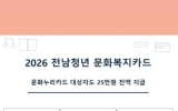 해남 박남도 기자2025. 11.18[나이스데이]전라남도는 2026년부터 전남 청년 문화복지카드 사업 추진 시 경제적 취약 계층(기초생활수급자·차상위계층)이 수혜를 받는 문화누리카드 지급자에게도 25만 원 전액을 지급한다고 밝혔다. 전남청년 문화복지카드는 청년의 문화 향유 기회를 넓히고 자기 계발을 돕기 위해 2022년부터 시행하고 있다. 전국 최초로 소득 기준 없이 청년에게 문화복지비를 10년간 최대 250만 원을 지원한다. 이를 통해 청년은 공연 관람, 학원 수강, 도서 구입, 체육시설 이용 등 다양한 문화·복지 혜택을 받을 수 있다. 기존 전남청년 문…