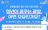 광양 손태성 기자2025. 11.17[나이스데이]광양청년꿈터가 11월 17일부터 11월 30일까지 ‘청년이 꿈꾸는 광양, 어떤 모습인가요?’를 주제로 청년 의견 수렴 이벤트를 진행한다. 이번 이벤트는 광양시 청년들의 다양한 목소리를 듣고, 청년이 바라는 광양의 미래상을 향후 청년정책과 프로그램 운영에 반영하기 위해 마련됐다. 참여 대상은 광양시에 거주하거나 광양시에서 활동하고 있는 18세~45세 이하 청년이다. 참여 방법은 광양청년꿈터 공식 SNS(네이버 블로그·인스타그램) 중 한 곳을 팔로우한 뒤, ‘청년이 바라는 광양의 모습’을 자유롭게 작성해 팔로우 인…
