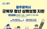 광주 이자형 기자2026. 02.17[나이스데이]광주광역시는 지난해에 이어 올해에도 광주 청년들이 국방의무에 전념할 수 있도록 ‘군복무 청년 상해보험 가입’을 지원한다. 지원 대상은 광주광역시에 주민등록을 둔 군복무 청년으로, 병역법에 따른 현역병, 상근예비역, 의무경찰, 의무소방원이다. 다만 보험 제도가 이미 마련된 직업군인, 사회복무요원 등은 대상에서 제외된다. 현역 군복무 청년이면 별도 신청 절차 없이 군복무 시작과 동시에 자동 가입되며, 전역이나 다른 지역으로 전출하면 해지된다. 주요 보장 항목은 ▲상해·질병 사망 및 후유장해(3000만원) ▲상해·질병 …