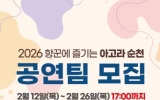 순천 손태성 기자2026. 02.12[나이스데이](재)순천문화재단은 오는 26일까지 ‘2026 항꾼에 즐기는 아고라 순천’ 문화예술 공연팀을 공개 모집한다고 밝혔다. 올해로 14년째 진행되는 아고라 순천은 그동안 축적해 온 열린 무대경험을 바탕으로 일상에서 시민 누구나 접근 가능한 공공 공연 플랫폼으로 지역 예술인들이 지속적으로 성장할 수 있는 지역 대표 공연 브랜드로 자리매김했다. 이번 공모는 사업 공고일 기준 순천시 거주 예술가(예술단체)로 해당 분야 전공자 등 공연 역량을 갖춘 개인 및 단체라면 지원할 수 있다. 모집 규모는 총 5개 장르 ▲대중음악 ▲양…