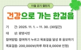 광양 손태성 기자2025. 10.21[나이스데이]광양시는 지역 주민의 건강생활 실천을 돕기 위해 11월 1일부터 30일까지 모바일 걷기 앱 '워크온'에서 ‘건강으로 가는 한걸음 11월 걷기 챌린지’를 운영한다고 밝혔다. 이번 걷기 챌린지는 1걸음당 1마일리지가 적립되며, 1일 최대 8천 마일리지가 누적된다. 기간 중 20만 보를 달성하면 20만 마일리지가 쌓여 모바일상품권(5천 원권) 응모가 가능하다. 시는 목표 걸음을 달성한 참여자 중 추첨을 통해 800명에게 상품권을 지급할 예정이다. 참여를 희망하는 시민은 모바일 걷기 앱 ‘워크온’을 설치하고 ‘광양시…