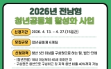 [나이스데이] 영광군은 청년들의 지역 활동 기반을 마련하고 지역사회 활동 주체로 성장할 수 있도록 지원하기 위해 오는 4월 27일까지 ‘2026년 전남형 청년공동체 활성화 사업’ 참여팀을 모집한다고 밝혔다. 이번 사업은 총 6개 팀을 선정해 팀별로 600만 원의 활동비를 지원하며, 발대식과 성과공유회, 네트워크 행사 등 다양한 교류 프로그램도 함께 운영될 예정이다. 신청 대상은 청년 5인 이상으로 구성된 팀·법인·단체이며, 모집 분야는 ▲지역연계 ▲일자리·창업 ▲문화·예술 ▲봉사활동 등 4개 분야다. 지역사회에 새로운 활력을…