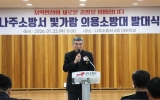 여수 손태성 기자2026. 01.22[나이스데이]전라남도의회 최명수 도의원(더불어민주당·나주2)은 1월 22일 나주소방서 대회의실에 열린 ‘빛가람 의용소방대 발대식’에 참석해 발대를 축하하고, 지역 안전 강화를 위한 의용소방대의 역할과 중요성을 강조했다. 이날 발대식에는 윤병태 나주시장, 신향식 나주소방서장과 소방공무원, 김용준·장숙희 나주시 의용소방대 연합회장과 의용소방대원, 이재태 전라남도의원, 나주시 의원 등 100여 명이 참석해 자리를 빛냈다. 빛가람 의용소방대는 채기천 대장을 중심으로 총 30명의 대원으로 구성됐으며, 나주 혁신도시 중심 지역인 빛가람…