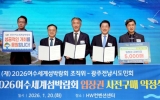 나주 이영욱 기자2026. 01.21[나이스데이](재)2026여수세계섬박람회조직위원회는 지난 20일 서울 종로구 HW컨벤션센터에서 광주전남시도민회와 ‘2026여수세계섬박람회 입장권 5,000매 구매약정’을 체결했다고 밝혔다. 이날 약정식은 조직위원장 김영록 전남도지사와 광주전남시도민회 양광용 회장을 비롯해 향우임원 600여 명이 참석한 가운데 진행됐다. 이번 구매약정은 지난해 체결한 조직위와 광주전남시도민회 간 업무협약에 따른 결실로, 협약 이후 실제 참여와 실천으로 이어진 대규모 구매 사례다. 광주전남시도민회는 1955년 출범한 국내 최대 규모의 향우단체로, …