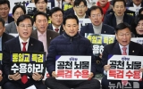 탑뉴스 뉴시스2026. 01.19[나이스데이] 국민의힘은 19일 단식 닷새째를 맞은 장동혁 대표의 농성장에서 규탄대회를 열고 여권의 통일교 유착과 공천 헌금 의혹에 관한 특검법 수용을 촉구했다. 송언석 원내대표는 이날 국회 로텐더홀에서 열린 규탄대회에서 "장 대표는 국회 한복판에서 목숨을 건 단식 투쟁을 이어가고 있다"며 이같이 말했다. 송 원내대표는 "이재명 같은 출퇴근 단식이 아니다. 정청래처럼 20일 단식했다면서 담배 피울 수 있는 단식이 아니다"라며 "글자 그대로 물과 소금에 의존한 완전한 단식"이라고 했다. 이어 "야당 대표가 오죽하면 곡…
