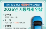 장성 황일섭 기자2026. 01.16[나이스데이]장흥군은 15일 2026년도 자동차세 연납 고지서를 장흥군에 등록된 모든 차량 소유자에게 일괄 발송했다고 밝혔다. 자동차세 연납 제도는 매년 6월과 12월 두 차례로 나눠 부과되는 정기분 자동차세를 1월에 미리 납부하면 공제 혜택을 주는 제도다. 올해도 1월 중 납부 시 4.5%의 세액 공제가 적용되며, 최근 어려운 경제 상황 속에서 가계 부담 완화에 도움이 될 것으로 군은 기대하고 있다. 납부 기한은 2026년 1월 16일부터 2월 2일까지이며, 납부 기간 내에 연납 고지서를 기반으로 납부를 완료하면 별도 신청 …